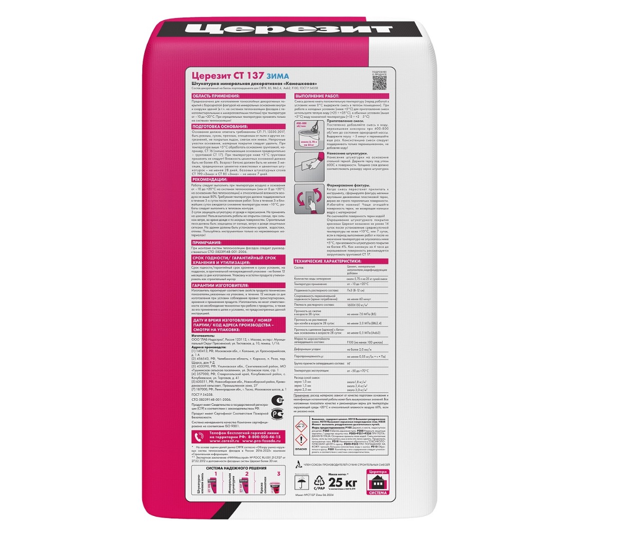 С помощью штукатурной смеси CT 137 изготавливаются декоративные тонкослойные покрытия, имеющие зернистую фактуру. Выпускается вариант белого цвета и версия, предназначенная под покраску, которая позволяет реализовывать любые цветовые решения. Существуют модификации по зернистости – 1,0; 1,5; 2,5 мм. Также имеется зимний вариант смеси для нанесения красителей при температурах ниже 0°C.