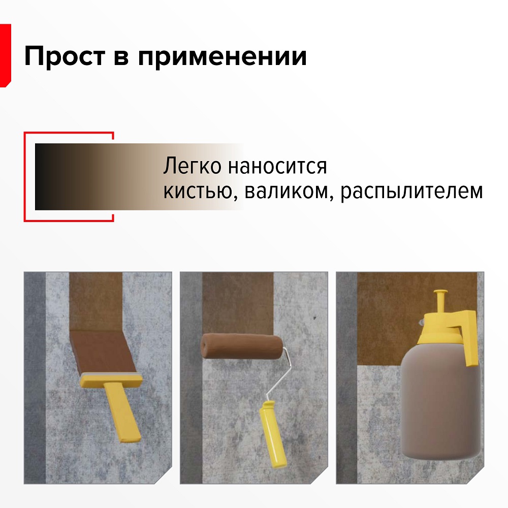 Праймер легко наносится кистью, валиком или распылителем. Он быстро высыхает — всего за 1 час. Его можно использовать на различных поверхностях, таких как бетон, цементно-песчаные смеси, дерево и другие материалы, которые впитывают влагу.